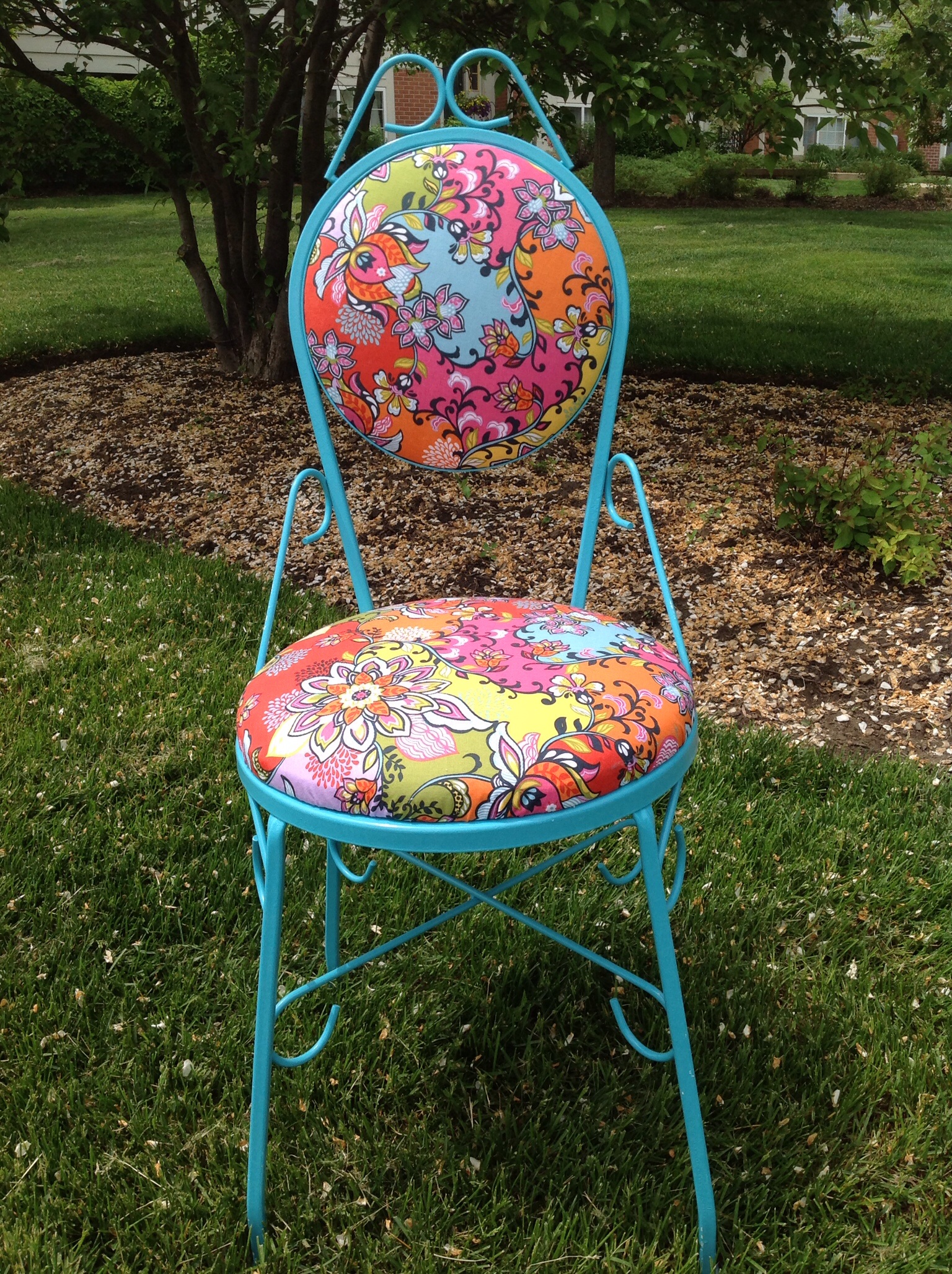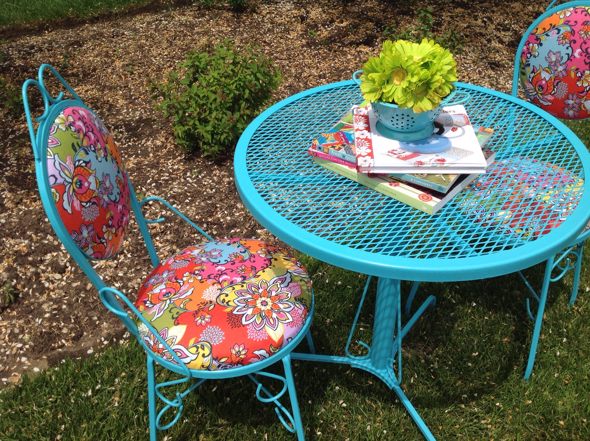 A little retro soda shop table and 2 chairs. It was hideous. Rusted. The seats were literally crumbling and I was pretty sure ‘things‘ were living in it…but I knew there was potential. It could be darn adorable. We couldn’t throw it away. Will she be upset if we do a little redo? We could use these in the quilt shows we attend or for photo shoots. We could make them… SewMod Style.