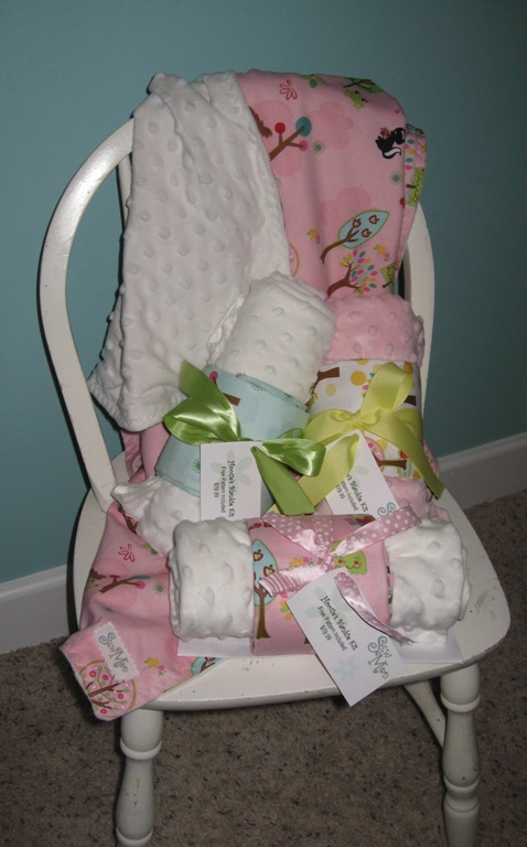 Last is the Hoo Blankie. It has a Minkie backing for the cuddly, snuggle factor and a yard of fabric for the front. Easy, breezy blankie and it comes with a free pattern.