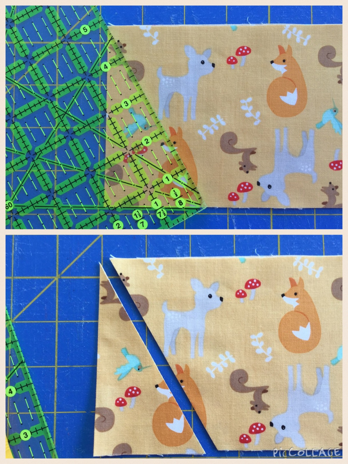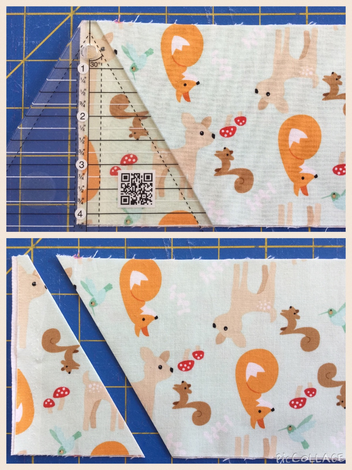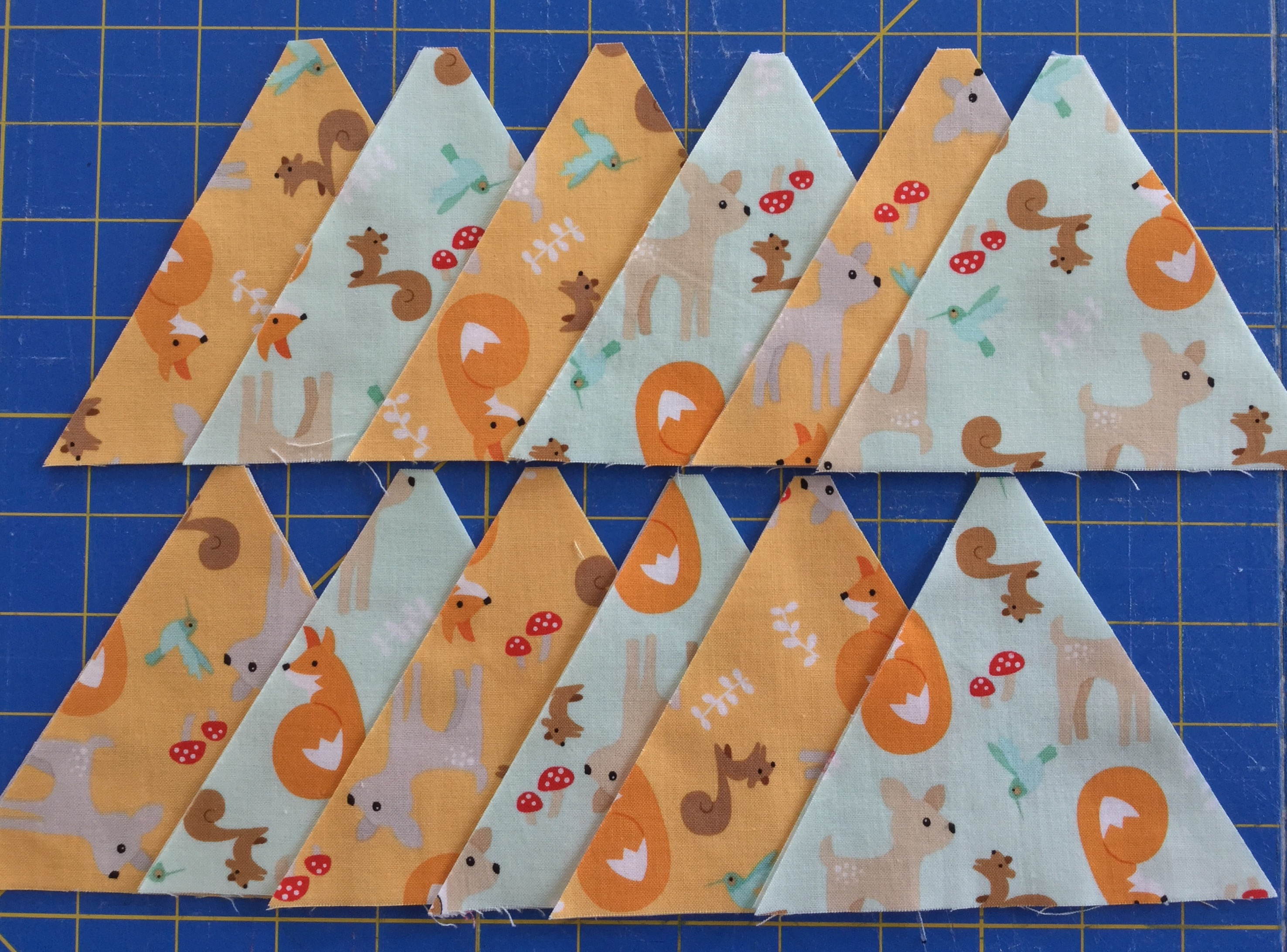I wrote this ‘little‘ tutorial for a new baby quilt KIT for the shop using equilateral triangles and Riley Blake’s fabric line called ‘Good Natured”. It really is a sweet quilt with the orange & mint…adorable nature friends… squirrels, baby deer, sweet little bluebirds and playful foxes among birch trees!