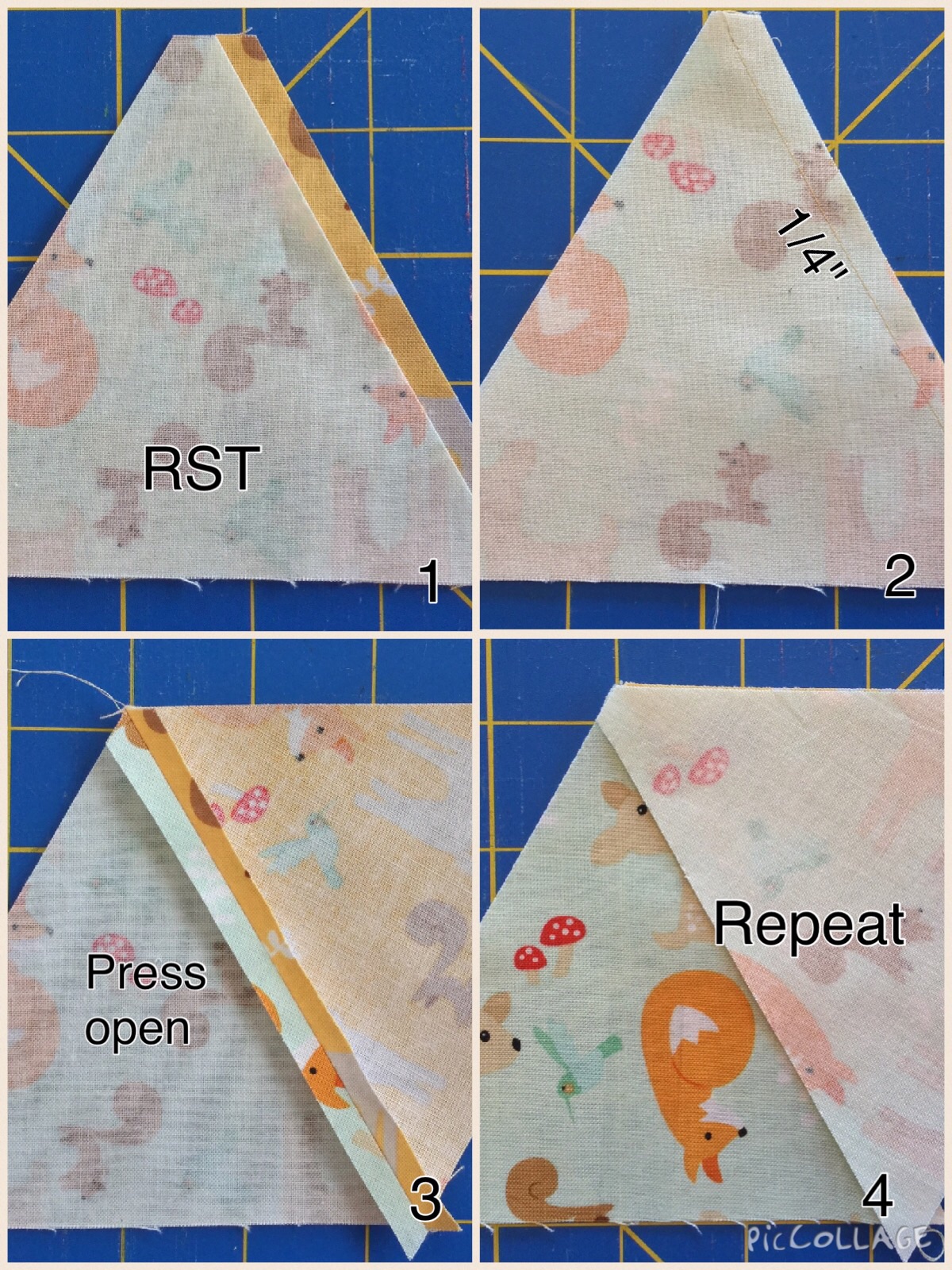 A ¼” seam allowance is used for sewing and ALL seams are pressed open. Do not iron your triangles or rows. This will cause stretching. Press.