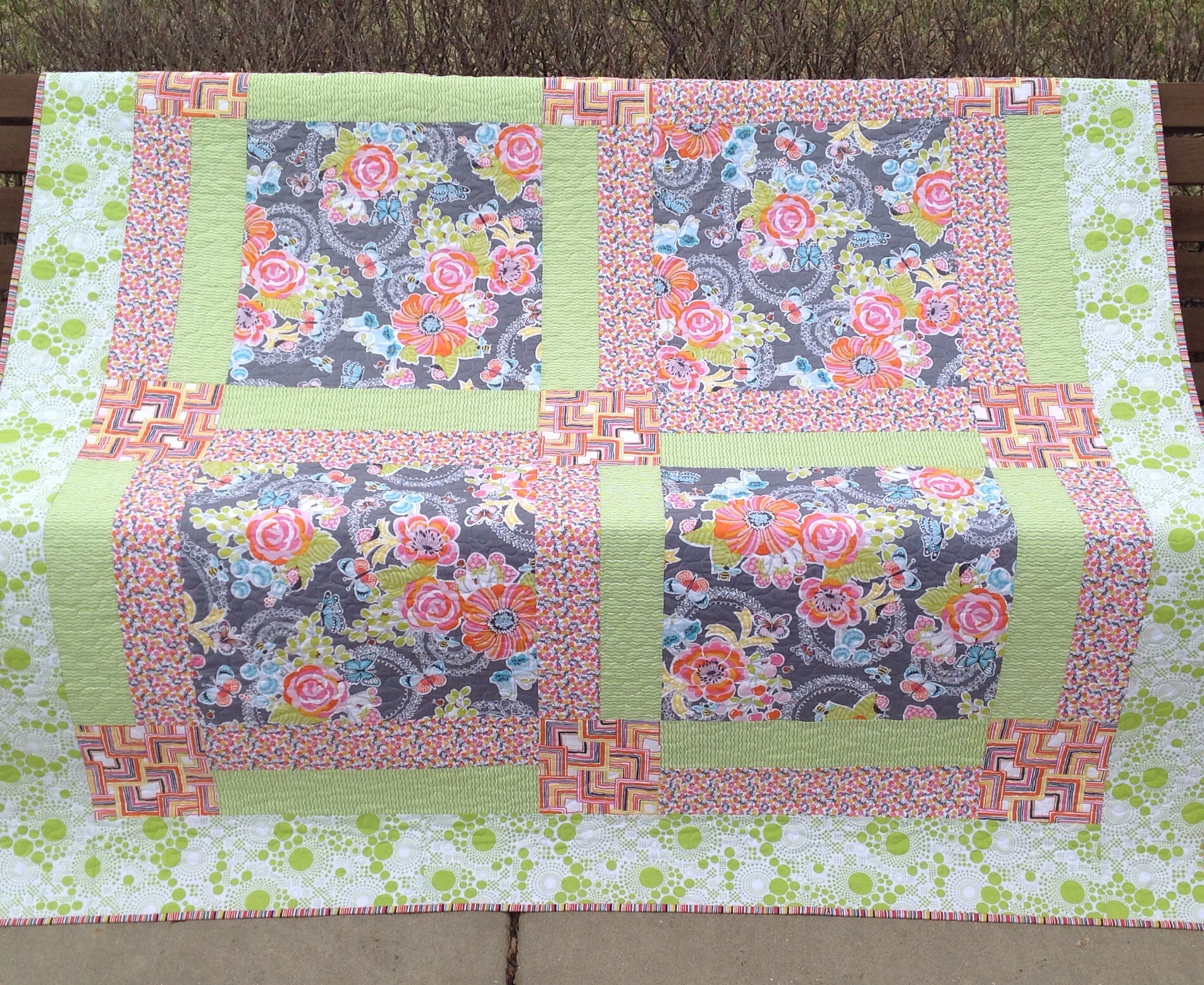 Summer Tweets has been so popular because it’s a great beginner pattern made to showcase your favorite large scale prints. Easy piecing and clear concise directions allow you to assemble this quilt quickly! It only takes me a day to make one of these. The finished quilt measures 61″ x 61″. It’s a great size for a holiday throw, picnic, or wall hanging.
