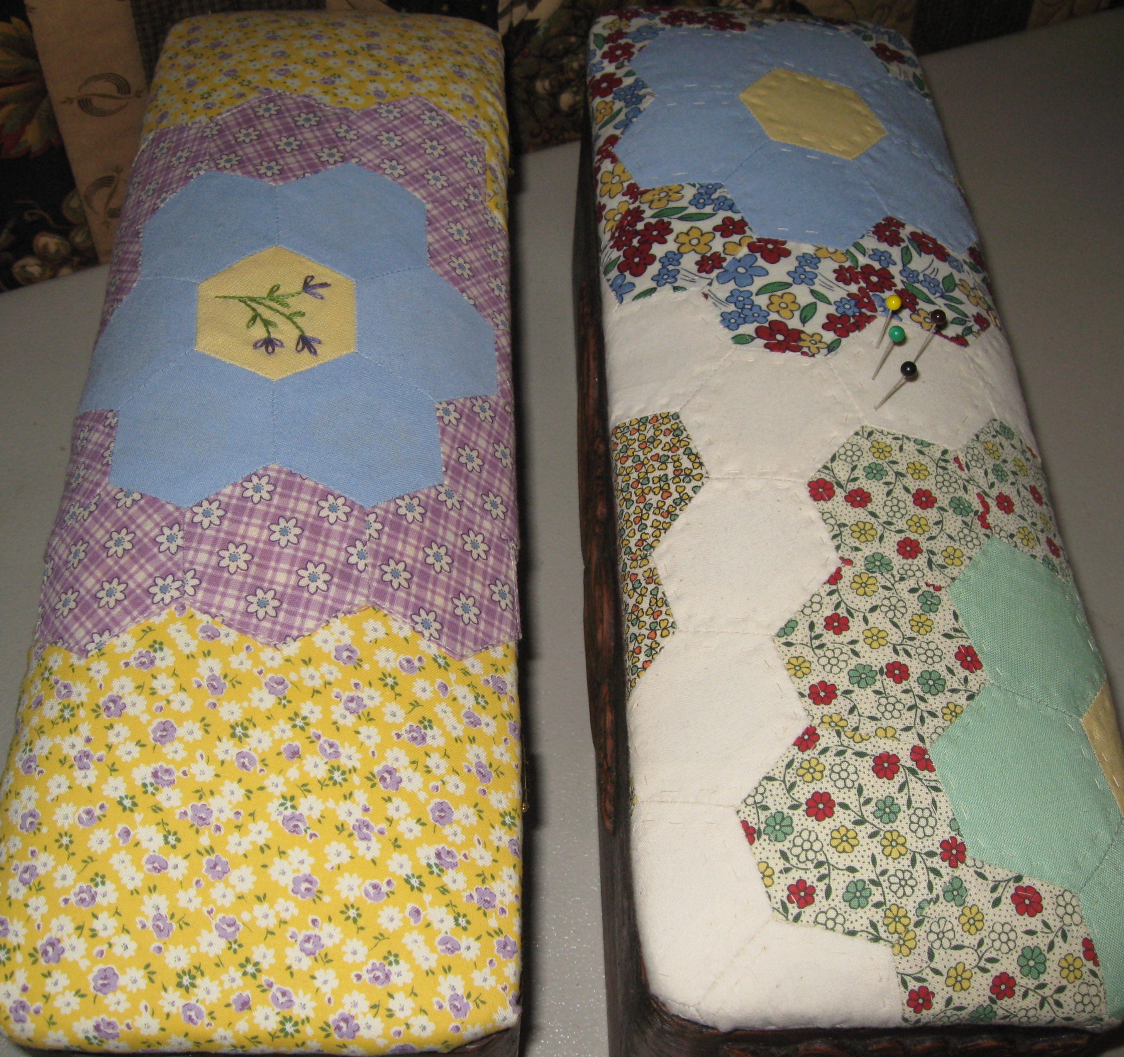 I finally have one of my sewing boxes listed on the Etsy store. I actually cut into..I know, say it isn’t so..the unfinished Grandmother’s Flower Garden quilt I was working on to make this box.